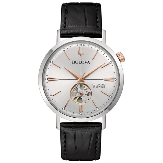 Orologio uomo solo tempo modello Aerojet Automatic. Cassa in acciaio lucido con fondello serrato a vite vista movimento, corona ad ore 2 placcata oro rosa. Movimento automatico 21 rubini con riserva di carica 40 ore. Vetro minerale leggermente bombato. Quadrante colore argento con oblò vista movimento, indici e lancette lucide oro rosa con punti luminosi. Cinturino in pelle stampa alligatore nera, fibbia con ardiglione e logo. Scatola libretto istruzioni e garanzia 5 anni originali. Ispirata al design vintage tipico degli anni ‘60, la collezione Aerojet celebra l’essenza del segnatempo classico con uno stile sobrio e dettagli curati. La collezione Aerojet nasce dalla collaborazione tra Bulova ed il governo USA per la fornitura di strumenti segnatempo per i mezzi di trasporto ferroviari e aerei. In particolare, il nome Aerojet scaturisce dalla collaborazione con la celebre compagnia aerea USA Pan Am, iniziata alla fine degli anni ’50. La collaborazione con la compagnia di bandiera ha dato origine al famoso quadrante diviso in quarti creato per il personale di volo della compagnia Americana.
