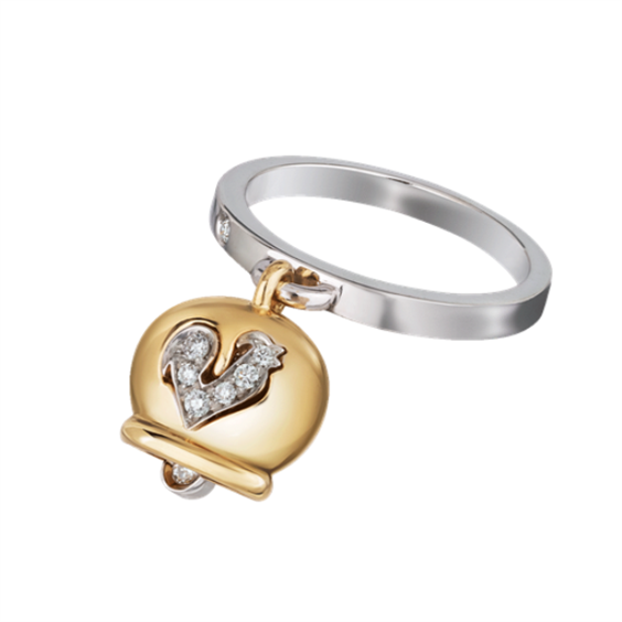Anello campanella in oro giallo e bianco e gallo in pavé di diamanti