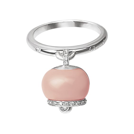 Anello campanella in oro bianco, diamanti e corallo rosa