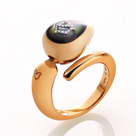 Anello contrariè in oro rosa con madreperla grigia e galletto in diamanti