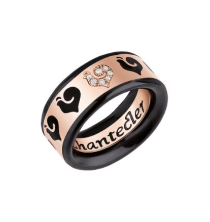 Anello 9mm in oro rosa 18Kt, 1 gallo con 7 diamanti incastonati a pavè (0.05ct) e smalto nero.