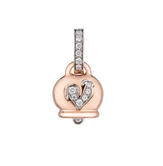 Ciondolo piccolo in oro rosa, diamanti e gallo in pavè di diamanti.