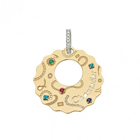 Ciondolo medio in oro giallo 9 kt. con turchesi, zaffiri, rubini, smeraldi e diamanti.