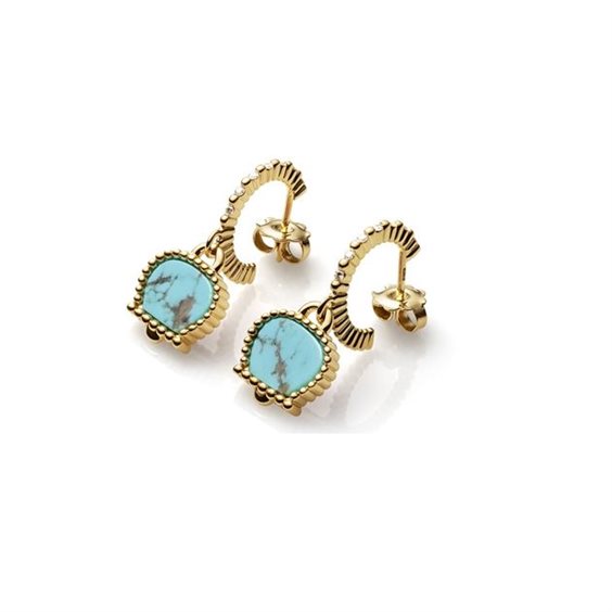 Orecchini cerchio piccolo in oro giallo diamanti, con campanella piccola in turchese