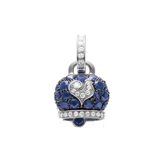Ciondolo campanella in oro bianco brunito zaffiri blu, con galletto in oro bianco e diamanti bianchi
