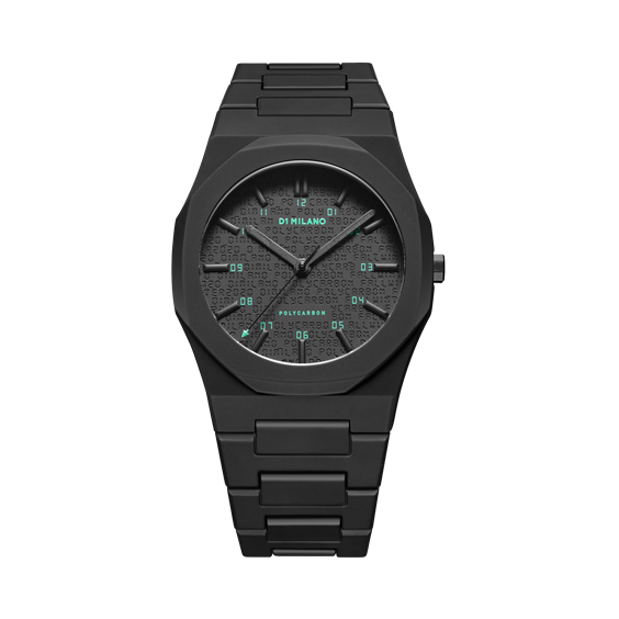 Orologio uomo solo tempo, in policarbonato nero con numeri verdi.