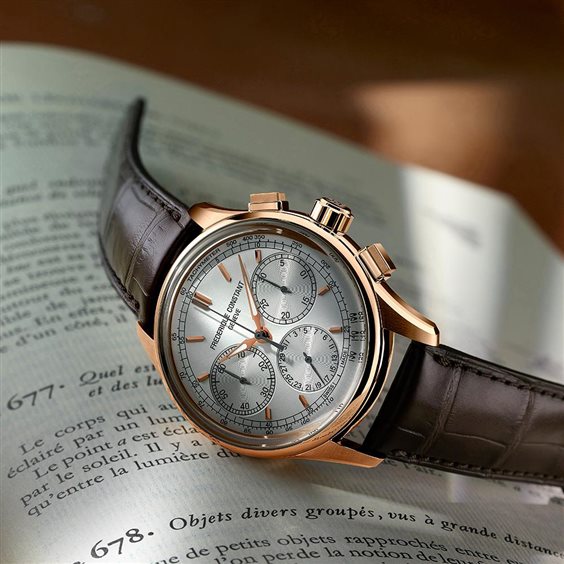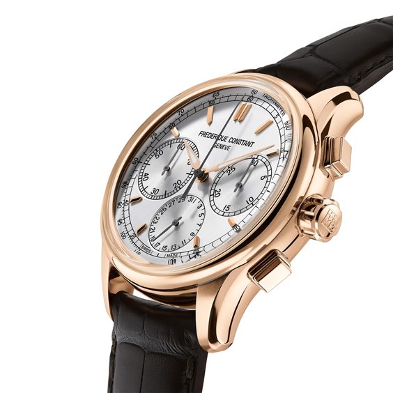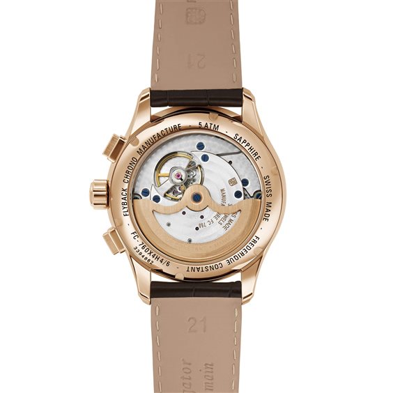 Orologio uomo FC-760 calibro manufacture, automatico, cronografo Flyback con data regolabile tramite la corona. 38 ore di riserva in carica. Cassa 42mm in acciaio lucidato e satinato placcato oro rosa. Vetro zaffiro cristallo retro trasparente. Quadrante argentato con indici in oro rosa, data esposta alle 6. Cinturino in pelle di alligatore marrone.