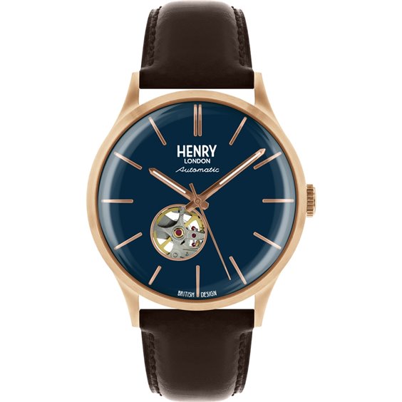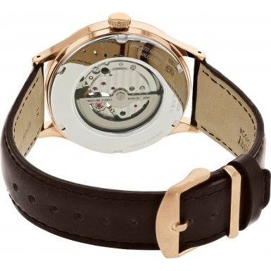Orologio automatico. Cassa in acciaio con doratura rosè, quadrante blu con riquadro scheletrato. Cinturino in pelle marrone scuro.