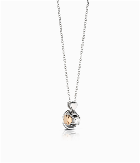 Punto luce in oro bianco 18 kt monta un diamante di 0,12 ct colore G con lateralmente incise due bambine in oro rosa 18 kt. Catena rolò cm 42 con possibilità si accorciare a 4 cm. Certificato di garanzia.