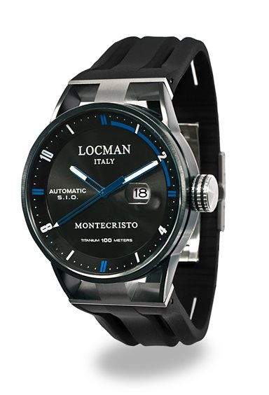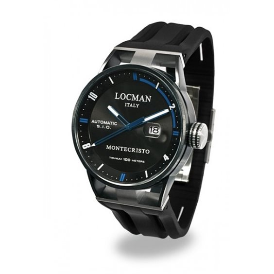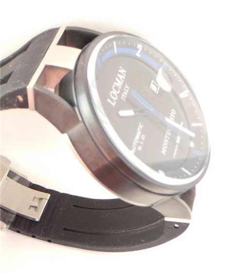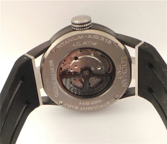 Orologio cassa titanio e acciaio trattato PVD nero, diametro 43mm, movimento automatico con massa oscillante personalizzata visibile dal fondo vitrè, vetro con lunetta di ingrandimento sulla data, cinturino silicone con chiusura deployante, water resistant 10atm