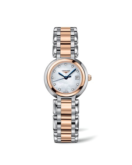 Orologio da donna a quarzo in acciaio con maglia centrale rivestita in oro rosa 18 carati, vetro zaffiro, quadrante in madreperla bianca con 11 diamanti Wesselton VS incastonati, per un totale di 0.032 carati. Bracciale in acciaio con maglia centrale rivestita in oro rosa 18 carati, fibbia chiusura déployante a tripla sicurezza e meccanismo di apertura a pressione Referenza L8.110.5.87.6