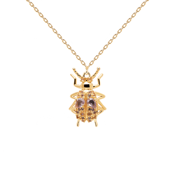 Collana in argento 925 con placcatura in oro 18kt. Pendente coleottero con pietre labradorite e zirconia.