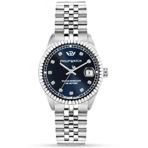 OROLOGIO PHILIP WATCH DONNA CASSA 35 MM QUADRANTE BLU CON DIAMANTI, IMPERMEABILE 10 ATM, VETRO ZAFFIRO, CORONA A VITE, CASSA E CINTURINO IN ACCIAIO