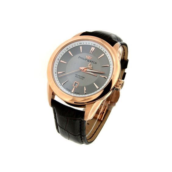 Orologio solo tempo ideato e realizzato dal noto brand Philip Watch L'orologio Philip Watch è il regalo ideale per un uomo che desidera accessori eleganti, esso è caratterizzato da una cassa in acciaio diametro 44 millimetri, un fantastico quadrante in antracite con datario e un bracciale in pelle marrone. Il modello R8251196004 Philip Watch è dotato di movimento al quarzo SWISS MADE, vetro minerale antigraffio, corona serrata a vite, fondello serrato a vite e la capacità water resistant 10 ATM.