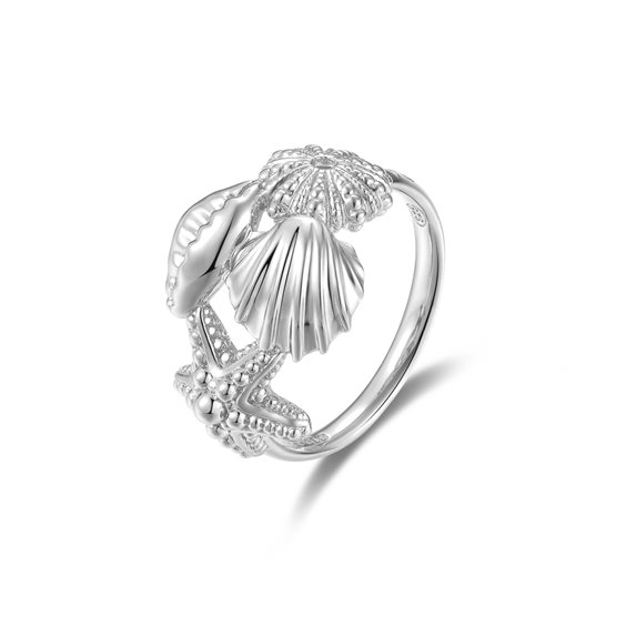 Anello in argento con guscio di riccio di mare, conchiglia Cripea, conchiglia di San Giacomo e stella marina