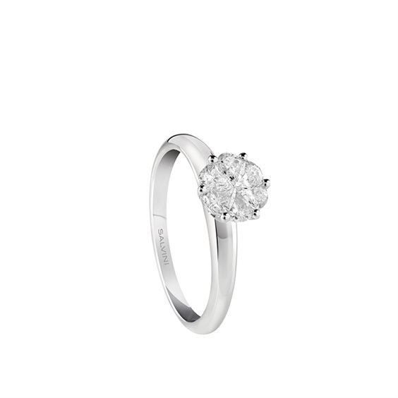 Anello Salvini collezione Petal Cut in oro bianco 18 Kt.lucido con testa formata da sei diamanti con originale taglio forma petalo del fiore di ct. 0.53 GH. Misura 13 modificabile. Garanzia e Certificato di Autenticità Salvini con assicurazione rapina e scippo e scatola originale.