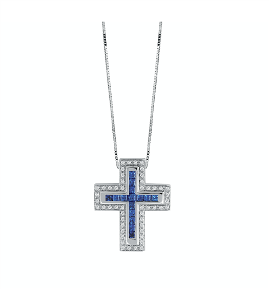 Collana in oro bianco 18kt, con croce con zaffiri carati 0,70 e diamanti carati 0,25.
