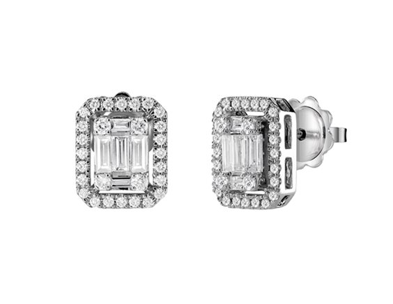 Orecchini punto luce della collezione Magia in oro bianco con diamante centrale a taglio baguette di caratura 0,40 di colore G e contorno di diamanti a taglio rotondo di caratura 0.30 di colore GH.