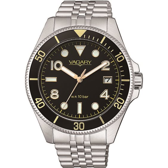 Orologio Solo Tempo Da Uomo Di Vagary Della Collezione Acua 1075th. Orologio Con Cassa In Acciao Con Fondo Serrato A Vite E Diametro Della Cassa Di 41 Mm e Quadrante Nero Con Indici Applicati E Numeri Ararbi E Ghiera Nera Con Inserti Color Oro. Bracciale In Acciao Integrato Con Chiusura A Pulsante. La Resistenza All'Acqua È Di 1Oatm. Orologio Con Movimento Al Quarzo Analogico. Orologio Solo Tempo. Orologio Dotato Di Datario E Vetro Minerale.
