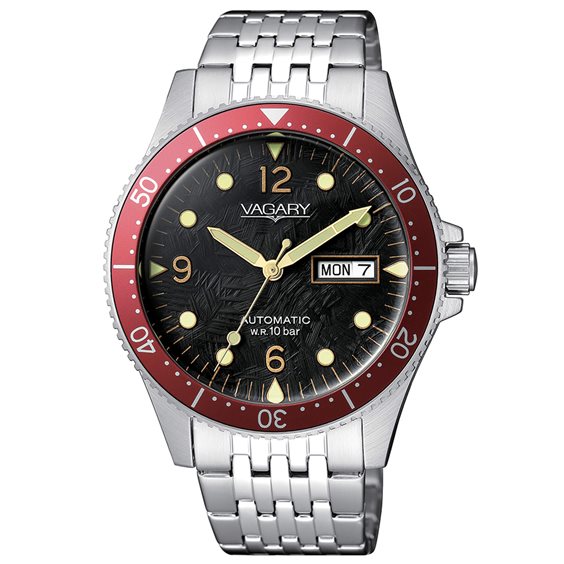 Movimento Meccanico a ricarica automatica cal 8200 con rotore personalizzato. 21 rubini, 21600 alternanze. 42 ore di riserva di carica. Caratteristiche Cassa e bracciale in acciaio con fondo a vite e oblo trasparente. Movimento a vista. Ghiera girevole in alluminio. Vetro minerale bombato. WR 10 bar. Dimensioni Diametro cassa 40 mm